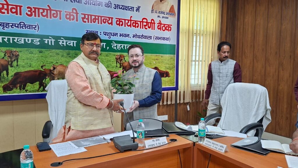 *देहरादून 30 अक्टूबर,2025 : उत्तराखंड गौ सेवा आयोग के मा. अध्यक्ष डॉ. पं. राजेन्द्र अणथ्वाल की अध्यक्षता में बृहस्पतिवार को मोथरोवाला स्थित पशुधन भवन सभागार में गौ सेवा आयोग की कार्यकारिणी की बैठक संपन्न हुई। जिसमें राज्य के सभी जनपदों में गौ सदनों के निर्माण, संचालित गौ सदनों की स्थिति और गौ कल्याण कार्यक्रम की विस्तार से समीक्षा की गई। आयोग की बैठक में गौ माता को राष्ट्रमाता का दर्जा देने सहित गोवंश संरक्षण हेतु कई प्रस्तावों को भी पारित किया गया।