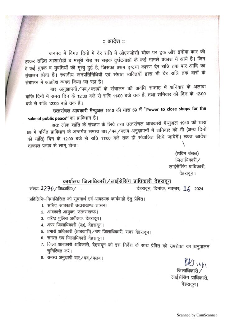 देहरादून 16 नवम्बर 24 : *जिलाधिकारी सविन बंसल ने जनपद अंतर्गत होटल हयात रेसीडेंसी को 24 घंटे बार संचालन की अनुमती को निरस्त करने की संस्तुति पर आबकारी आयुक्त ने उक्त अनुमति को निरस्त कर दिया है,जबकि वर्तमान डीएम के कार्यभार ग्रहण करने से पूर्व आबकारी आयुक्त द्वारा 27 अगस्त 2024 को हयात रेसीडेंसी को 24 घंटे बार संचालन की संस्तुति प्रदान की गई थी, जिसे वर्तमान डीएम की संस्तुति पर निरस्त कर दिया गया है, जो कि अब निर्धारित समयावधि रात्रि 11 बजे तक ही संचालित होगा।*