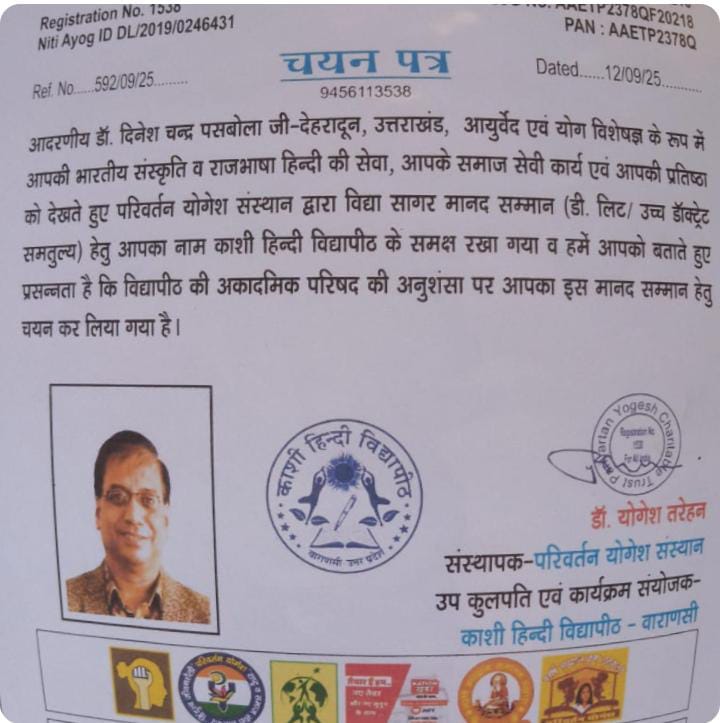 देहरादून: 14 अक्टूबर 2025, मंगलवार। काशी हिन्दी विद्यापीठ, वाराणसी, उत्तर प्रदेश द्वारा डॉ० डी० सी० पसबोला को उच्च मानद डॉक्टरेट (Higher Honorary – D Litt) के लिए नामित किया है। विद्यापीठ की अकादमिक परिषद की अनुशंसा के पश्चात कुलपति डॉ० संभाजी राजाराम बाविस्कर के अनुमोदन के पश्चात उप कुलपति एवं कार्यक्रम संयोजक डॉ० योगेश त्रेहन द्वारा इस सम्बन्ध में पत्र जारी कर दिया गया था।