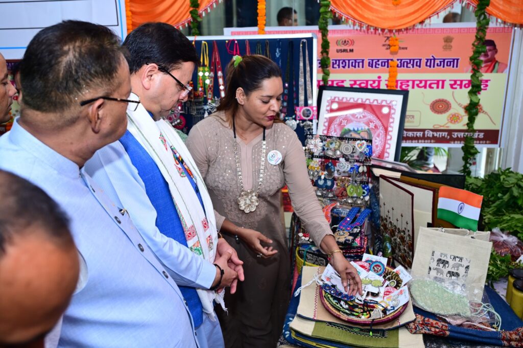 देहरादून : प्रदेश के मुख्यमंत्री पुष्कर सिंह धामी ने आज सचिवालय में मुख्यमंत्री सशक्त बहना उत्सव योजना एवं मुख्यमंत्री महिला स्वयं सहायता समूह सशक्तिकरण योजना के अन्तर्गत महिला समूहों द्वारा लगाए गए स्टॉलों का शुभारंभ किया और अवसर पर इन स्टॉलों का अवलोकन करते हुए स्थानीय उत्पादों की खरीदारी भी की।